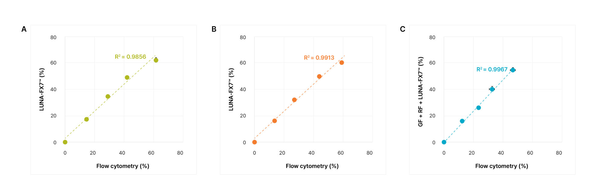 Figure 2. LUNA-FX7™-measured cell percentages were plotted against flow cytometry values for (A) GF+ (R² = 0.9856), (B) RF+ (R² = 0.9913), and (C) GF+RF+ double-positive cells (R² = 0.9967). Data points represent the mean ± SD of three independent replicates. Dotted lines represent linear regression fits.
