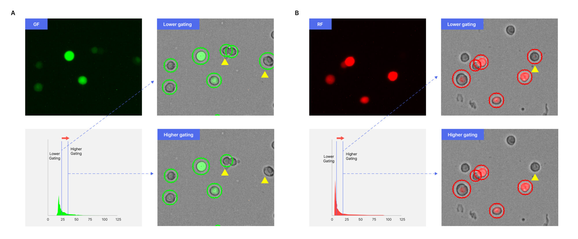 Figure 1. Representative fluorescence images of GF (A) and RF (B) and corresponding histograms illustrating Lower and Higher Gating thresholds. Dashed lines indicate the gate-to-image correspondence. Green and red circles denote detected GF+ and RF+ cells, respectively. Yellow triangles (▲) indicate cells detected exclusively under lower gating.