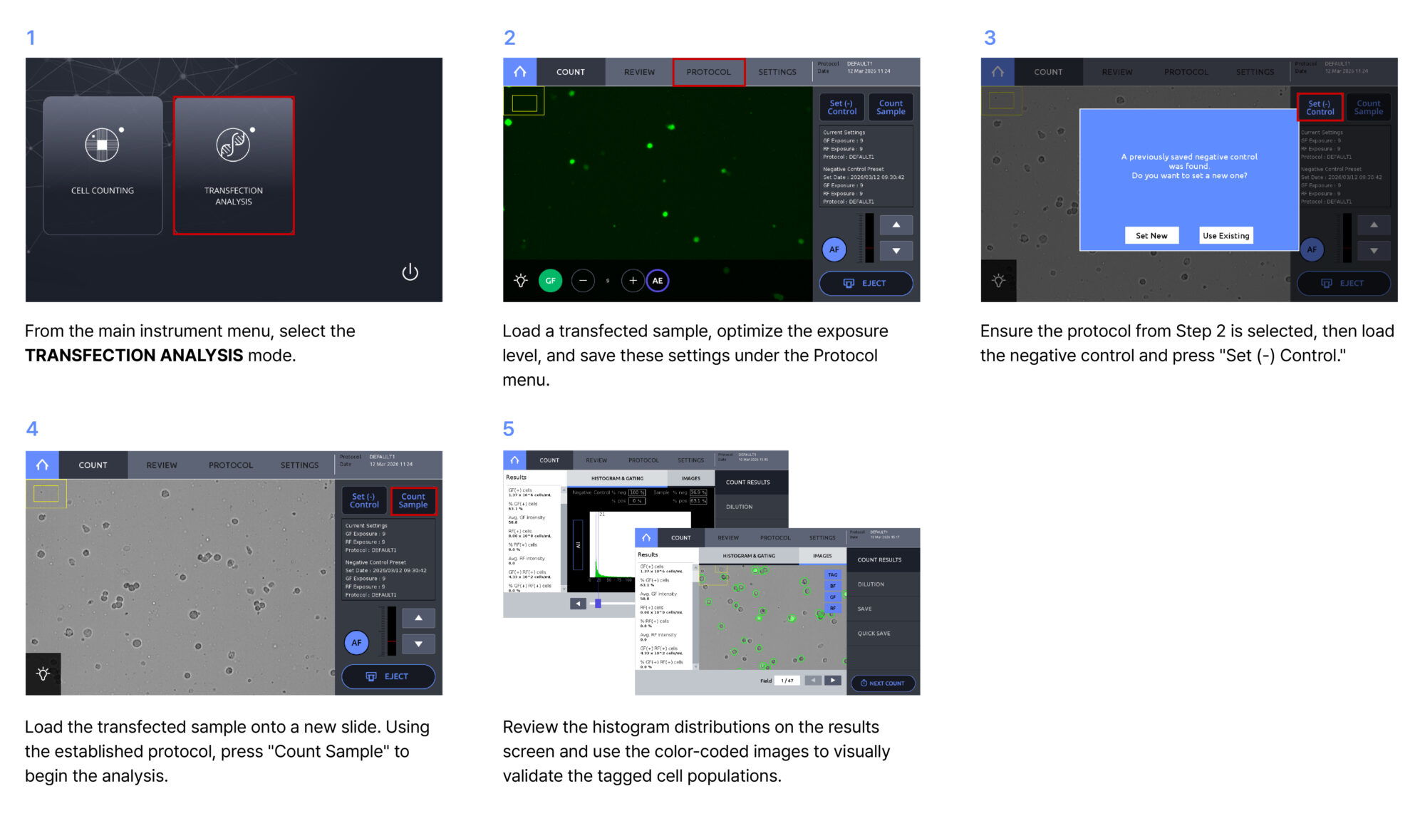 By analyzing 47 high-resolution images per sample, the LUNA-FX7™ ensures statistically robust results even for heterogeneous samples or experiments with low transfection rates, making it a practical and accessible benchtop alternative to flow cytometry for single- and dual-color transfection analysis.