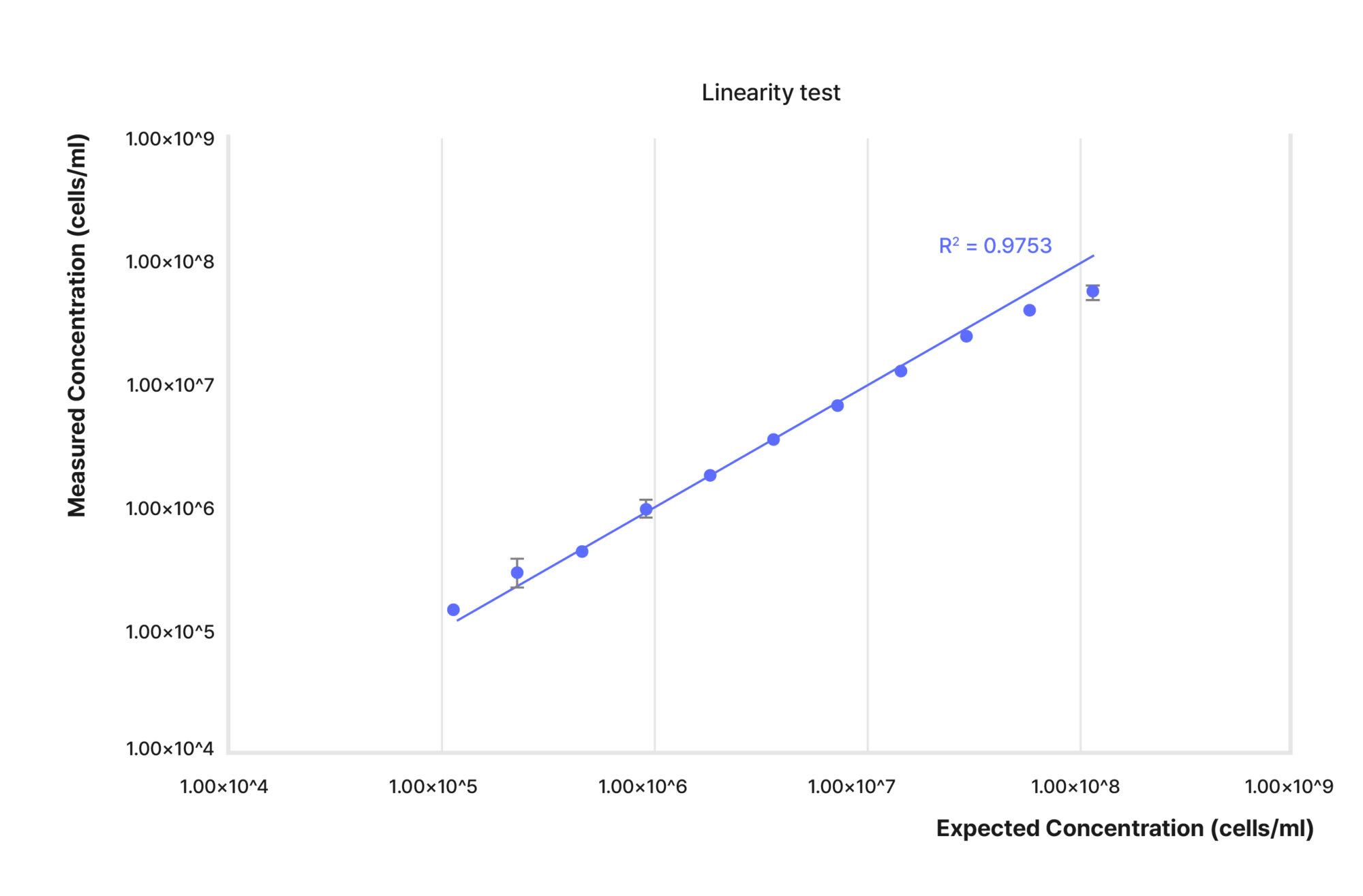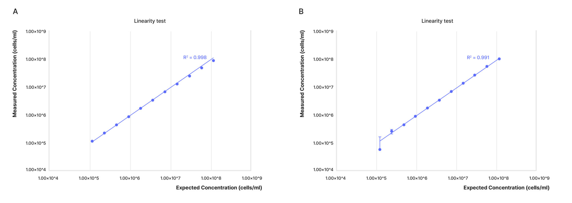 Through these experiments and data from the previous application note [An analysis of optimal cell counting range of the LUNA-FX7™], we can think about the limit of quantification about yeast cells. The average size of yeast cells is 3 ~ 4 μm, and the size of a typical mammalian cell is 10 μm. Therefore, compared to the range of 5.00 × 10^4 to 1.50 × 10^7 cells/mL for mammalian cells in the 2-ch slide, it can be adjusted to 5.00 × 10^5 to 3.00 × 10^7 cells/mL for yeast cells. Because the cell size differs by more than 2 times, it is impossible to count at a low concentration of 5.00 × 10^4 cells/mL as in mammalian cells, but due to the size difference, it is possible to count cells with a high concentration that is twice as high as 1.50 × 10^7 cells/mL.